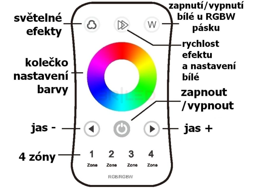 Typ ovládání: RF 2,4 GHz  |  Počet zón: 4  |  Podporované LED pásky: CCT, RGB, RGBW, RGBCCT