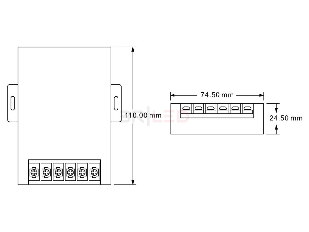 RGB RF přijímač stmívač LED 3x10A 5-24VDC pro RGB ovladače dimLED Radiofrekvenční přijímač stmívač pro RGB LED produkty. Přijímač může být ukrytý (za zdí, sádrokartónem či ve skříni), není nutná přímá viditelnost přijímače pro ovladač. Přijímač je kompatibilní s RGB ovladači řady dimLED !!! Pro ovládání více okruhů je nutno použít jeden přijímač na každý okruh. Na každý přijímač lze napárovat až 10 různých ovladačů řady dimLED a tak ovládat z několika míst. V případě přerušení a poté opětovného připojení napájení (například přerušením napájení zdroje) má tento přijímač paměť nastavení intenzity (intenzita osvětlení se vrátí na naposled nastavenou). Specifikace přijímače: Vstupní napětí 5-24VDC Proudové zatížení 3x10A (12V 360W, 24V 720W) Přenosová frekvence 2,4GHz Dosah až 30m Počet ovladačů Lze spárovat max. 10ks na 1 přijímač Rozměry 110 x 75 x 25mm Paměť posledního nastavení po odpojení napájení: ANO