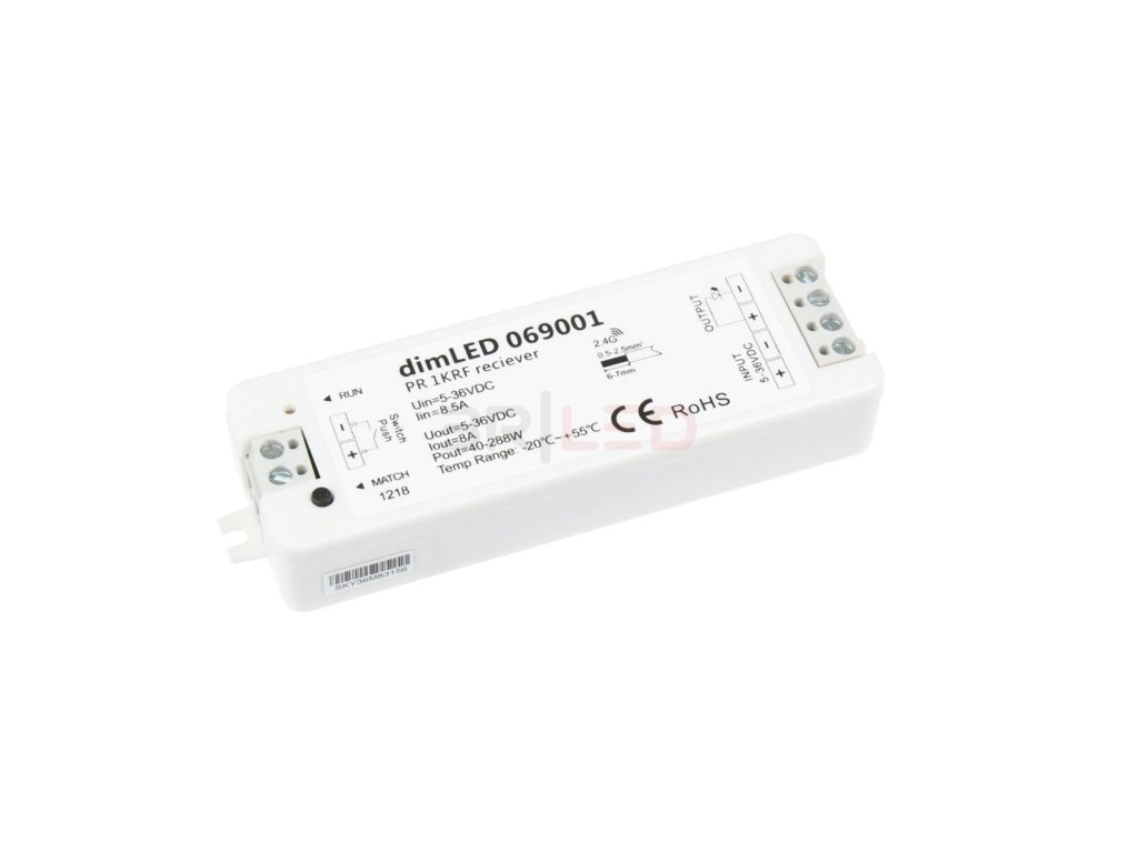 Tento výkonný RF přijímač/stmívač je určený pro jednobarevné LED pásky a funguje s napětím od 5 do 36 V DC. Je kompatibilní se všemi ovladači dimLED a umožňuje bezdrátové ovládání bez nutnosti přímé viditelnosti. Přijímač lze skrýt za stěnu, do nábytku nebo pod sádrokarton, aniž by to ovlivnilo jeho funkčnost.