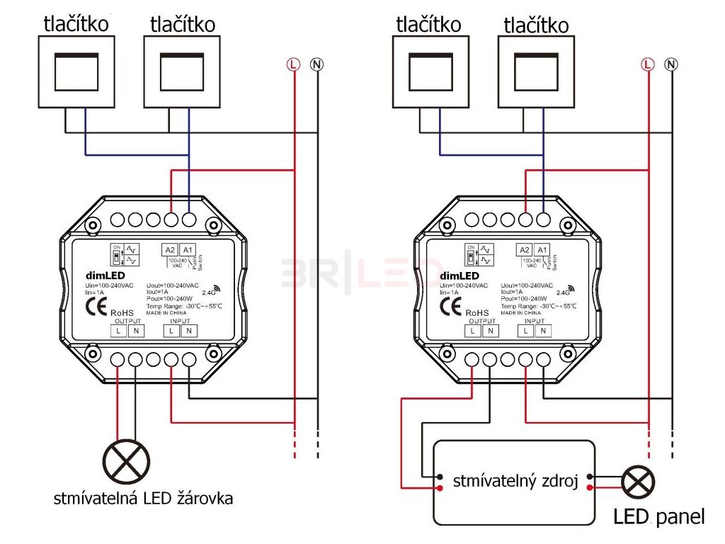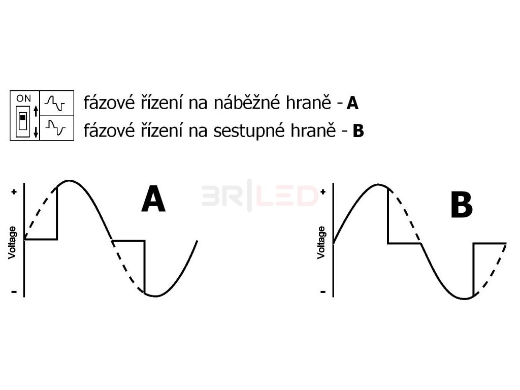 Stmívání ořezáváním půlvlny – vzestupné nebo sestupné hrany (nastavení DIP přepínači). Možnost spolupráce s dalšími přijímači v rámci systému dimLED (i 12/24V).