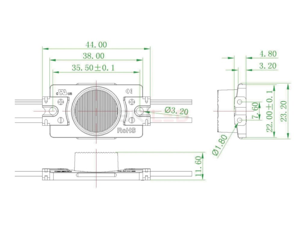 Modul je vybaven LED čipy 2835 SMD San’an s barevnou teplotou 7000K (studená bílá), které poskytují vysokou svítivost 125 lm na modul. Díky technologii vstřikování IP krytí je modul voděodolný a prachotěsný, což zajišťuje jeho spolehlivost v různých podmínkách.