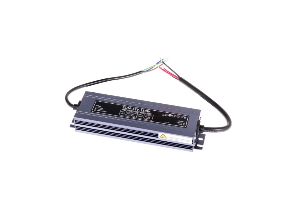 LED napájecí zdroj 12V / 150W je voděodolný, kompaktní a spolehlivý zdroj, vhodný pro napájení LED pásků a LED modulů v interiéru i exteriéru.
