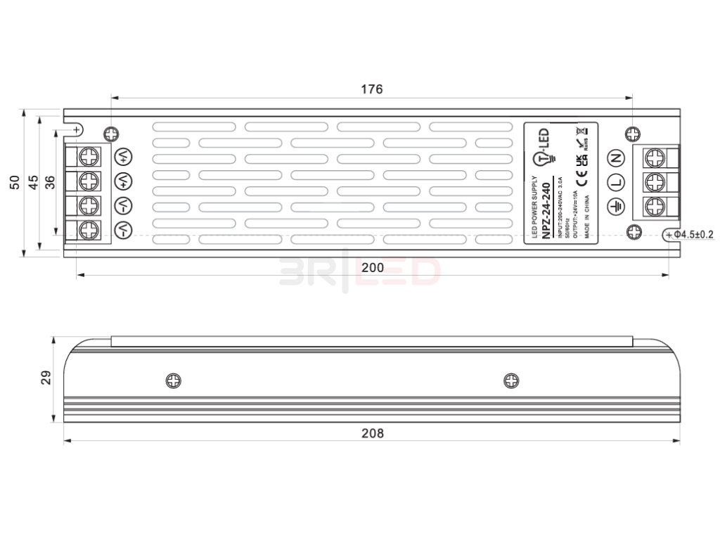 Díky kompaktním rozměrům (208 x 50 x 29mm), certifikacím CE, EMC, ROHS a vysoké životnosti je tento zdroj ideální volbou pro vnitřní LED aplikace.