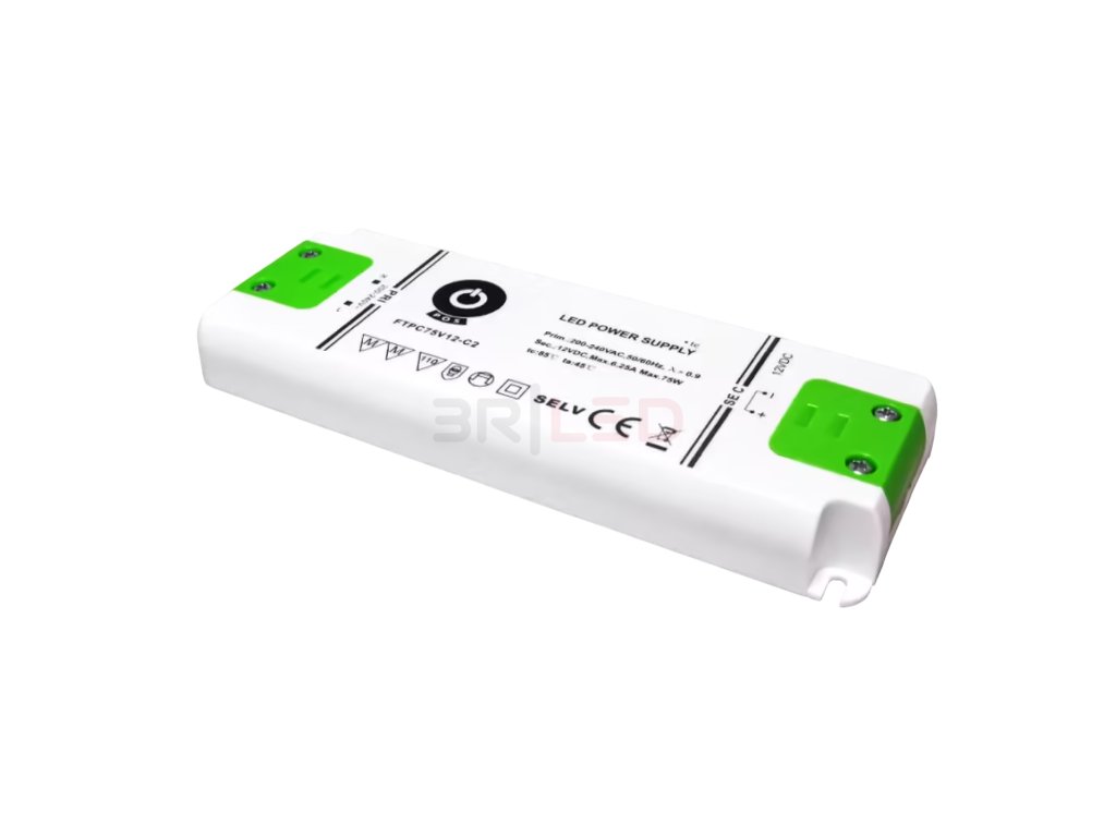 Zařízení poskytuje stabilní výstupní napětí 12V DC s proudem 6,25A, což umožňuje napájení LED osvětlení s celkovým výkonem až 75W. Zdroj je chráněn proti zkratu, přetížení a přehřátí – v případě problému se automaticky vypne a po odstranění závady obnoví svůj provoz.