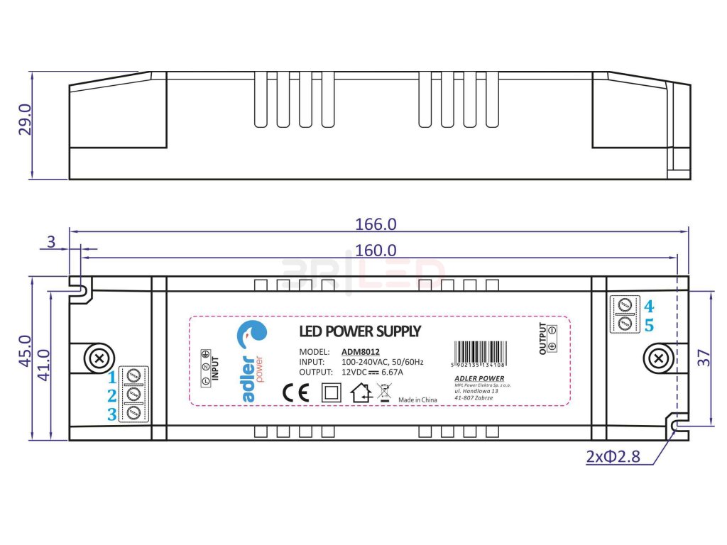 Výkon: 80W  |  Výstupní napětí: 12V DC  |  Proud: 6,67A