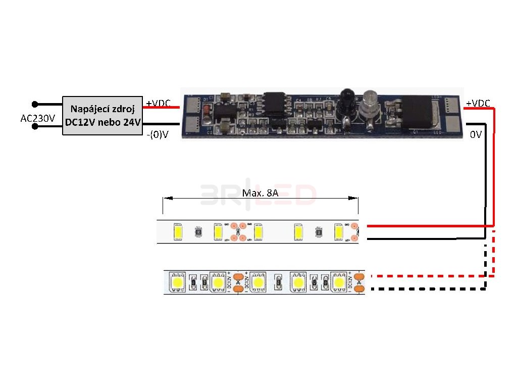 Díky kompaktním rozměrům 10 × 55 × 10 mm (včetně senzoru) se snadno vejde do hliníkových LED profilů a nenarušuje estetiku osvětlení. Funguje s nízkonapěťovými systémy 12V nebo 24V DC a umožňuje řídit zátěž až 8A.