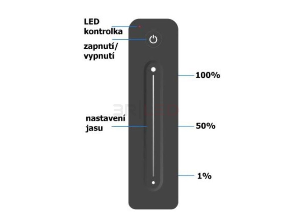 Ovladač umožňuje plynulou regulaci jasu v rozsahu 0–100 % s 256 úrovněmi. Měkký náběh a setmění zajišťují komfortní ovládání bez blikání. Díky paměti posledního nastavení se po výpadku napájení LED osvětlení vrací do předchozího stavu.