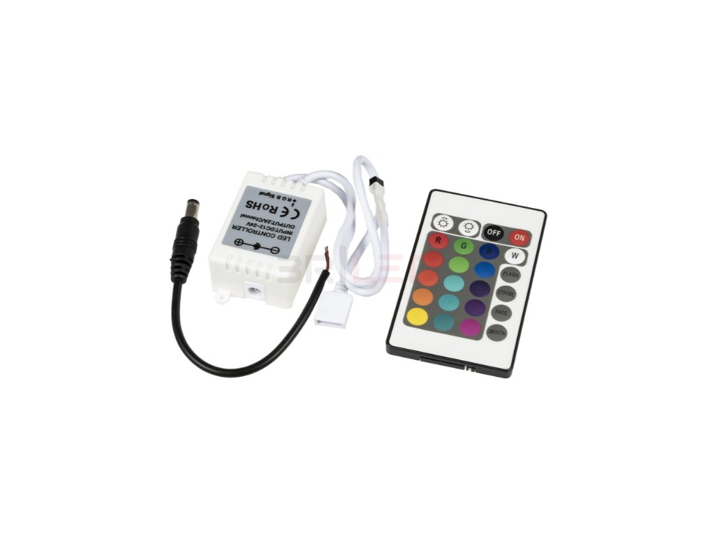 Ovladač disponuje 24 tlačítky, která umožňují rychlou volbu barev, úpravu intenzity jasu a přepínání mezi dynamickými režimy. K dispozici je 16 přednastavených barev a 4 různé efekty, včetně přepínání a prolínání 7 barev. Stmívání zajišťuje plynulou regulaci jasu pro dosažení optimální atmosféry v prostoru.