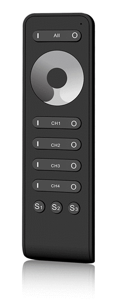 Bezdrátový ovladač RF 2.4 GHz je určen pro ovládání jednobarevných a CCT LED systémů. Nabízí 13 funkčních tlačítek a dotykové kolečko pro přesné a plynulé nastavení jasu nebo teploty světla. Možnost ovládání až 4 nezávislých zón umožňuje komfortní řízení rozsáhlých instalací.