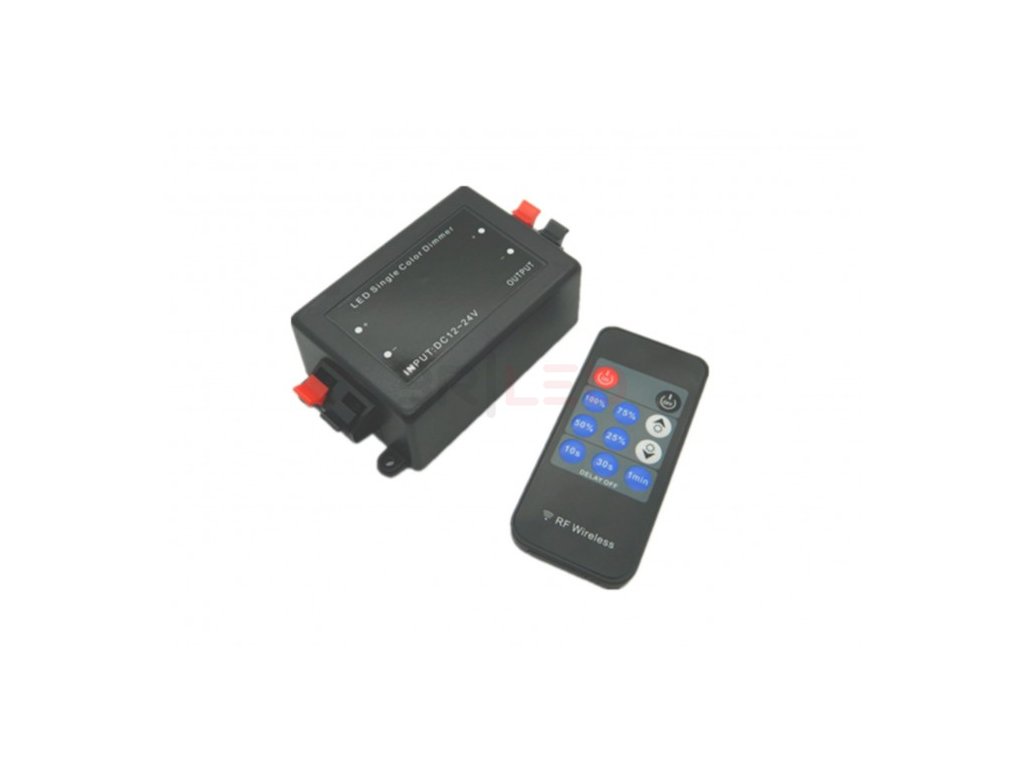 Jednokanálový RF stmívač umožňuje bezdrátové ovládání jasu LED pásků, LED žárovek a LED modulů bez nutnosti přímé viditelnosti mezi ovladačem a přijímačem. Přijímač lze skrytě umístit za stěnu, sádrokarton či do nábytku. Ovládání probíhá na frekvenci 433,92 MHz s dosahem až 20 metrů.