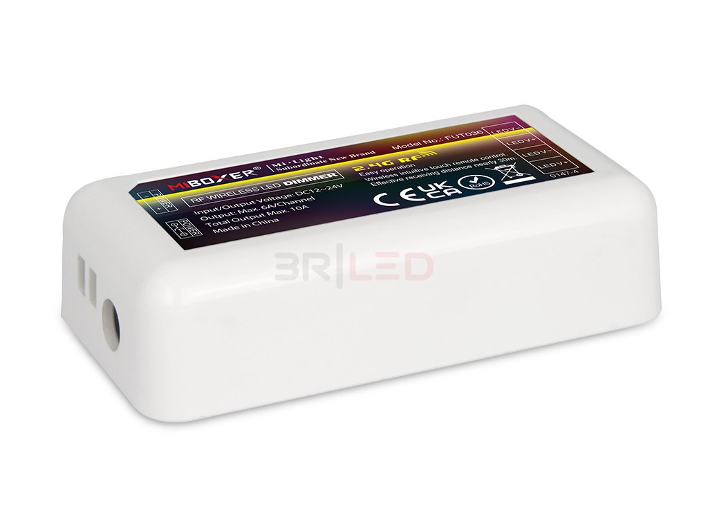 Mi-Light FUT036S je kompaktní bezdrátový přijímač určený pro jednobarevné LED pásky a světelné zdroje. Díky své velikosti je vhodný pro diskrétní montáž i v omezených prostorách. Pracuje s napětím 12–24 V DC a podporuje zatížení až 12 A.