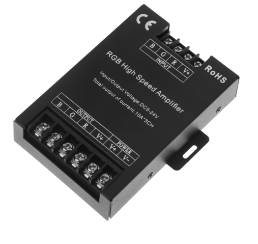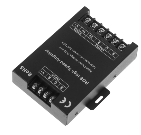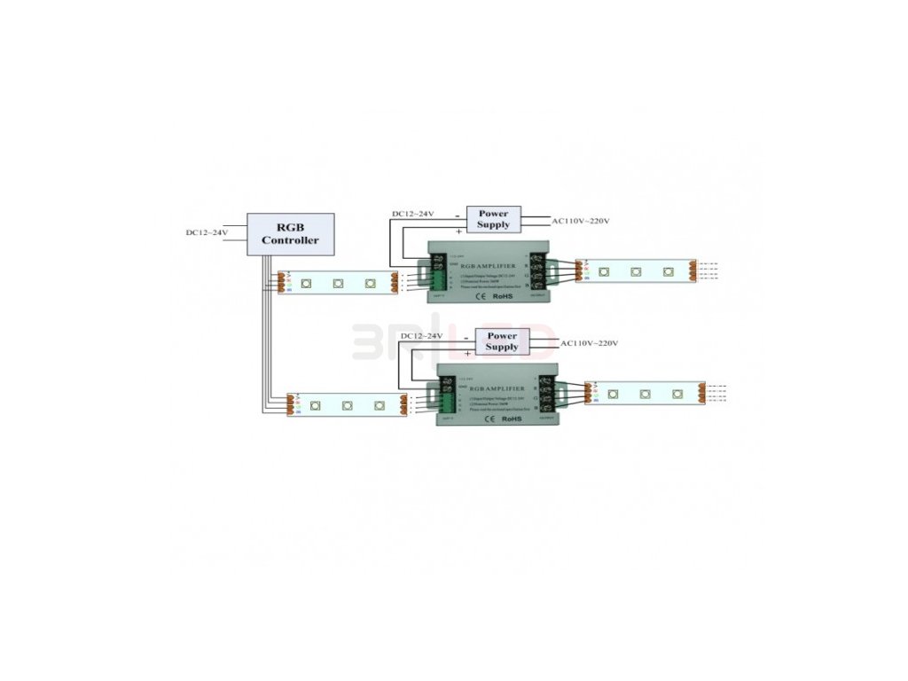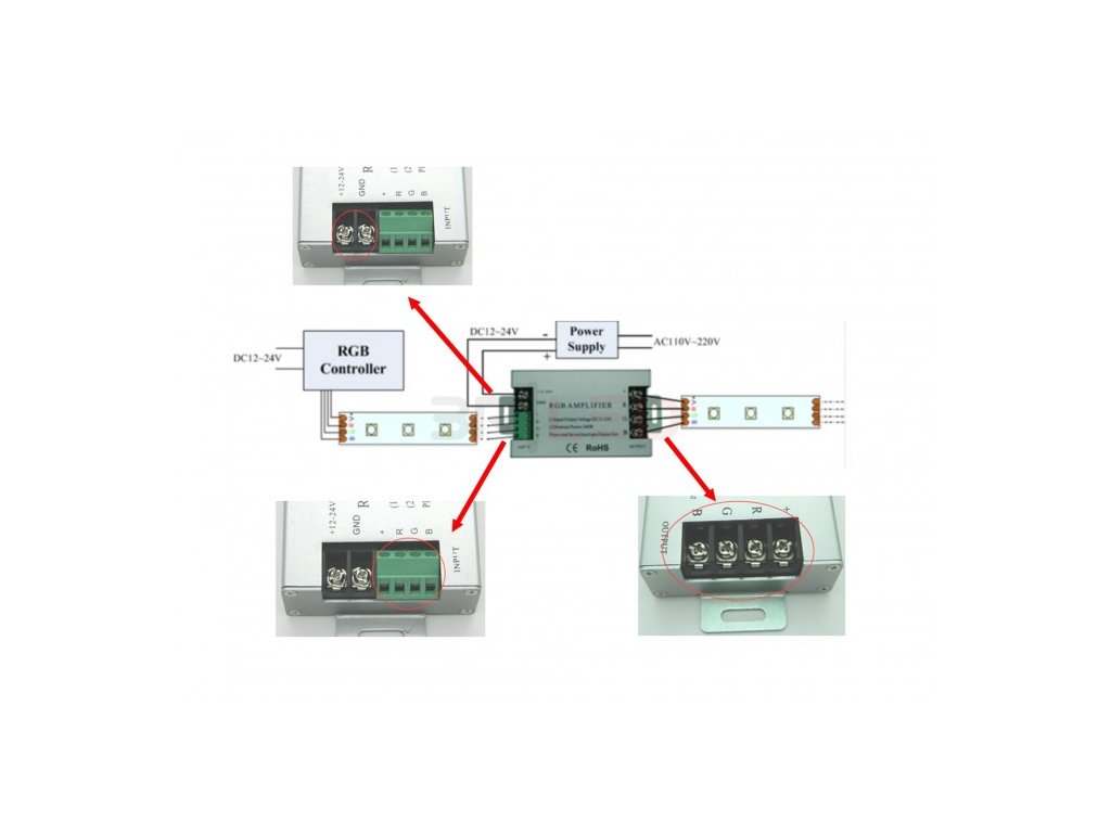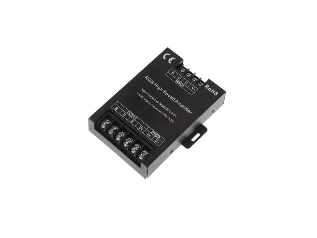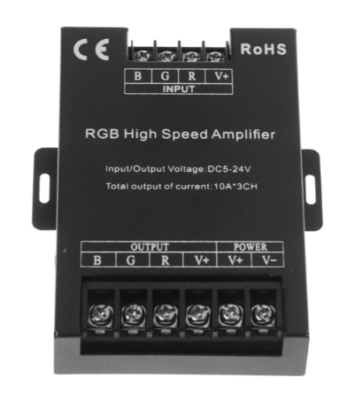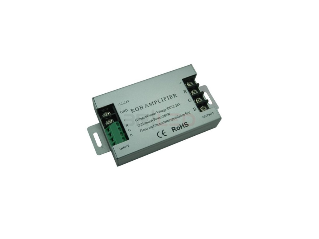 Tříkanálový zesilovač RGB signálu je určen k rozšíření výkonu ovladačů LED pásků a modulů. Umožňuje připojit další úsek LED pásků až do 360 W při 12 V nebo 720 W při 24 V bez přetížení hlavního ovladače.