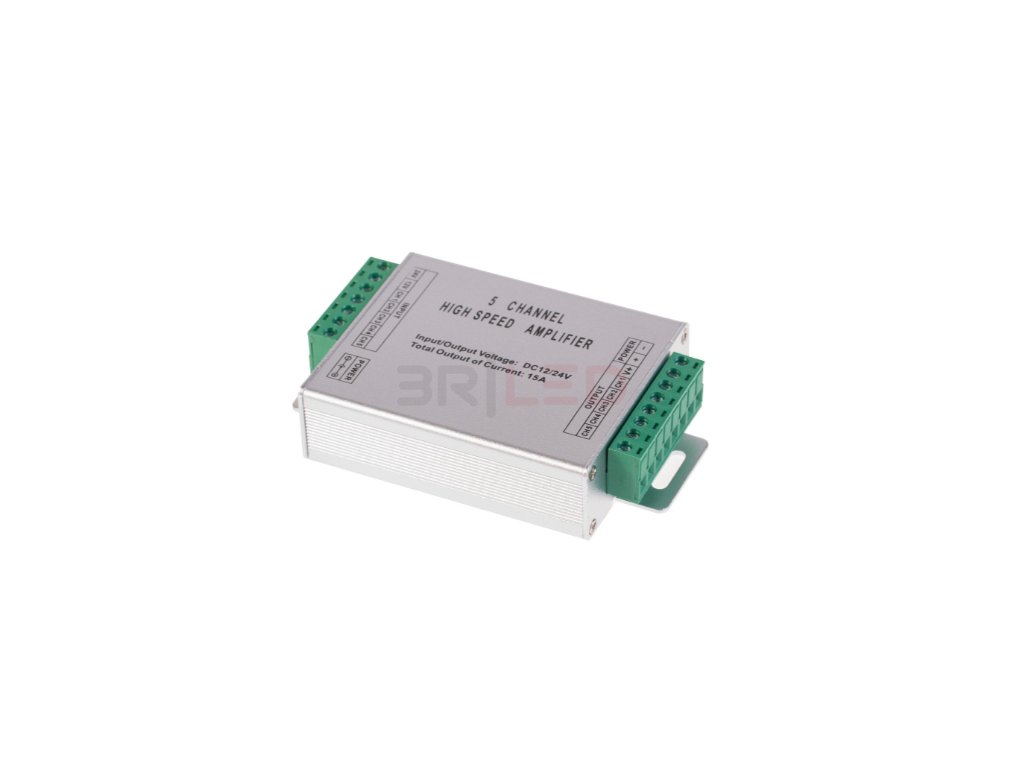 Výkonný 5kanálový LED zesilovač signálu, určený pro stabilizaci a rozšíření LED instalací. Kompatibilní s RGB, RGBW a RGB+CCT systémy, umožňuje plynulé a bezchybné ovládání i rozsáhlých světelných sestav s výkonem až 360 W. Ideální volba pro domácí i profesionální použití.